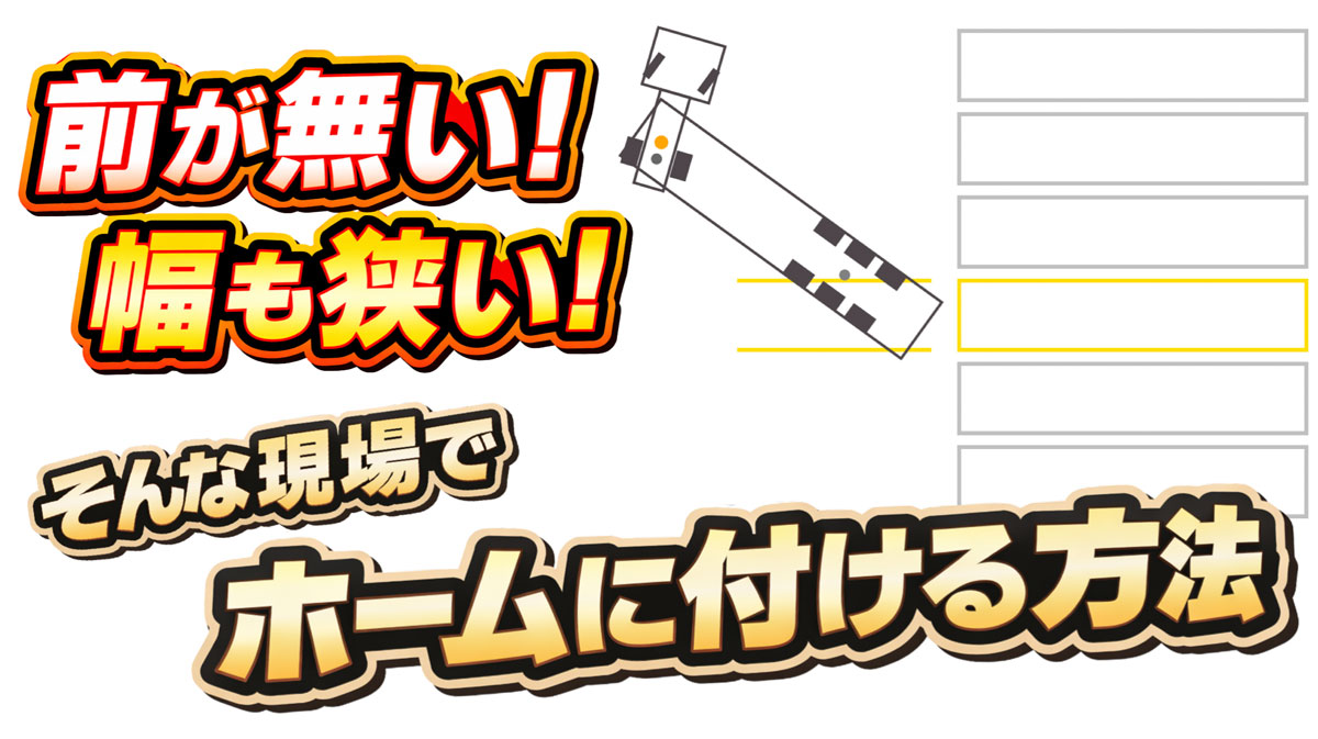 今回のテーマは、ホーム前を左折でアプローチし、一度ホームを通過して前方に進出したあと、右バックで黄枠のホームに付けるという運転操作です。