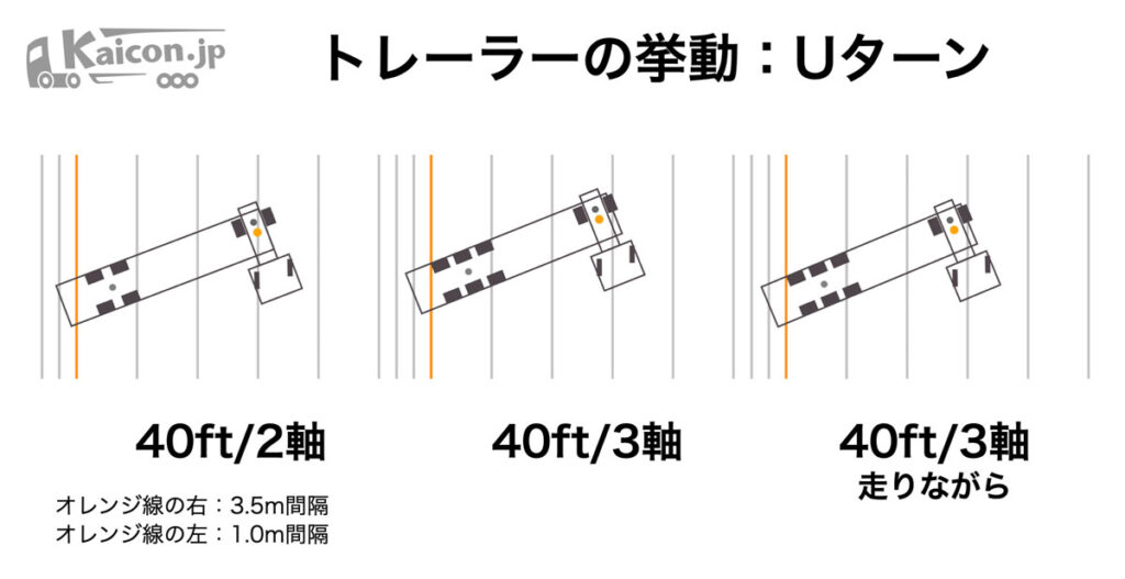 さらに、40ft/3軸で停車状態からではなく低速で走りながらUターンしたらどうなるのかというのも見て下さい。